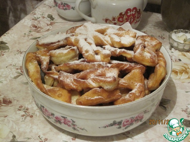 В кефир добавить сахар, соль, ваниль, яйцо, масло и соду, размешать немного вилкой, затем подсыпая просеянную муку замесить мягкое тесто, сильно не забивать, накрыть и оставить "отдыхать" на 20-30 (чем дольше тесто отдохнет тем воздушнее будут пышки). минут. Затем посыпать стол мукой, разделить тесто на 2 части, раскатывать прямоугольный пласт толщиной 1-1.5 сантиметр, режем на небольшие прямоугольнички, в середине прорезаем отверстие, и выворачиваем тарарушки как хворост.