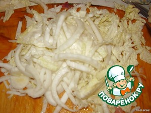 пекинскую капусту нарезать и смешать со смесью взбитых яиц, соли и перца (можно добавить мелко нарезанный зеленый лук)