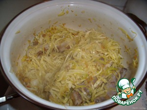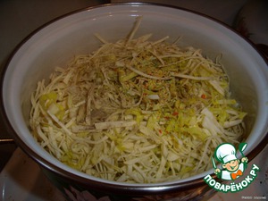 Добавляем шинкованную капусту и приправы. Недолго жарим, следим, чтобы не подгорела.