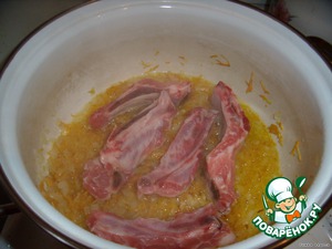 Кладем свиные ребрышки. Обжариваем, перемешивая.