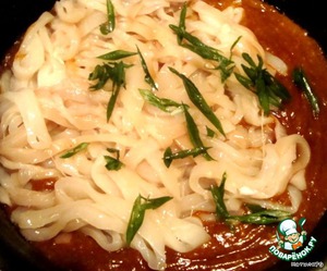 В соус выкладываем кальмары, нарезанный зеленый лук. Прогреваем две минуты.