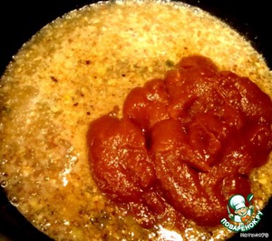 Вливаем в сковороду вино и томатную пасту, солим и перчим по вкусу. Прогреваем одну минуту.