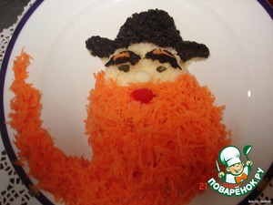 Из картофеля и маслинок делаем голову, шляпу и брови. Дальше укладываем огурчик, лук, горошек и морковь, все присыпать специями и полить оливковым маслом.