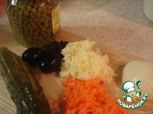 приготовим продукты необходимые для салата(морковь,картофель и маслинки на терке,лук,огурчик порезать мелко
