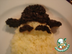 укладываем картофель в форме лица и шляпу из маслин и брови