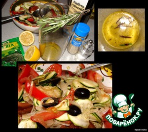 Готовим заправку: оливковое масло (думаю, можно и с растительным), лимонный сок, соль, перец белый, мяту и иголки розмарина складываем в блендер и все хорошо взбиваем.