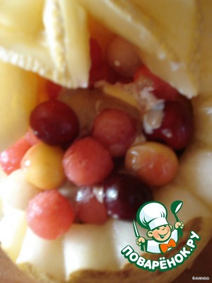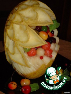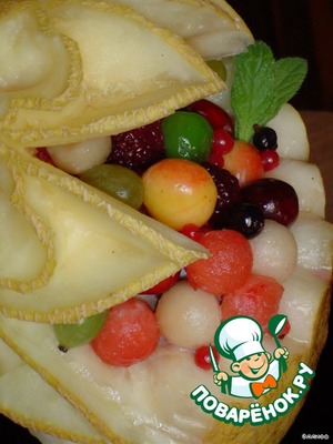 Начнем приготовление "фруктовой сказки" с вырезания шариков из дыни и арбуза с помощью ложки-нуазетки (или нарезаем кубиками).
