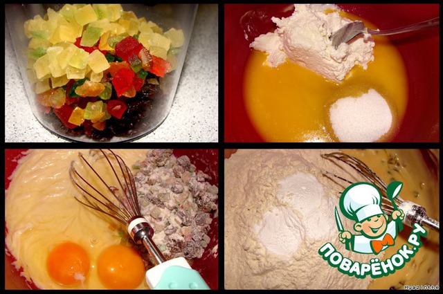1 ст. л. этой смеси добавить к измельченым цукатам и изюму, встряхнуть, чтобы мука равномерно распределилась.