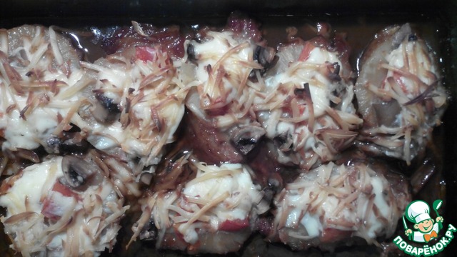 1. На кусочки ананасов уложить шляпки шампиньоны, как крышечки.