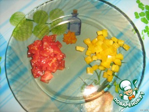 Помидор очищаем от кожи и мякоти, нарезаем кубиком. Перец тоже режем кубиком.