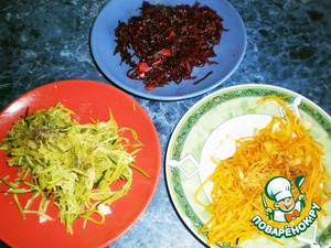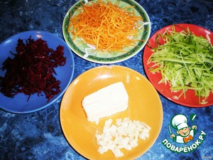 С кабачка и цуккини снять узкими продольными лентами кожицу, натереть на корейской тёрке. Морковь очистить и тоже натереть. Тоже проделать со свёклой. Чеснок очистить и измельчить.