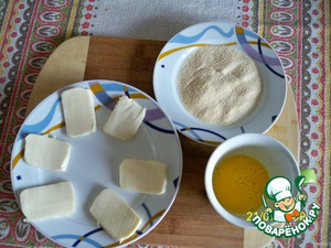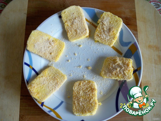 Ломтики сыра обмакнуть в яйцо, затем запанировать в панировочных сухарях. Обжарить в оливковом масле до получения легкой золотистой корочки.