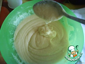 Масло нарезать кусочками, положить в металлическую миску и поставить на медленный огонь плавиться. Тем временем, в другую миску разбить 2 яйца, добавить сахар, хорошенько перемешать. Затем, добавить сметану (я беру магазинную, в упаковке 100-150 г.), перемешать. Добавить манку, перемешать. Растопленное масло влить в полученную массу, перемешать. Просеять муку, перемешать. Тесто получается не слишком жидким, но и не очень густым. Примерно, как густая сметана. -
