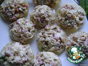 Ветчину, лук и петрушку порезать, сыр натереть. Заправить майонезом и горочкой выложить на кружок ананаса.