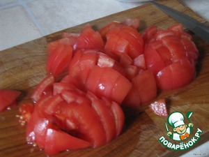 • Помидоры облить кипятком, снять шкурку, порезать.