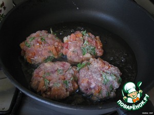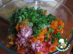 • Перемешать фарш, помидоры, морковь, яйца, батон, замоченный в молоке, зелень, соль, перец по вкусу.