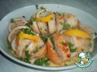 Немного остудить, порезать кольцами, украсить лимоном и зеленью.