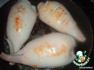 Дальше обжарить нафаршированные кальмары с двух сторон по паре минут (жарить в смеси сливочного и растительного масла + 2 зубка чеснока)