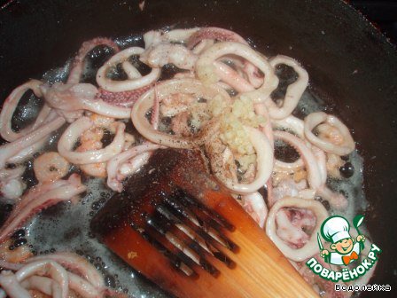 На сковородку положить немного сливочного и влить немного растительного масла и обжарить наш морской коктейль, совсем немного, пару минут.
