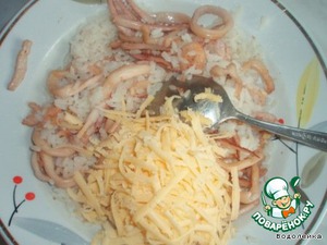 Делаем наш "фарш". К обжаренным морепродуктам добавляем отварной рис и натертый сыр (я терла простой твердый, не было у меня пармезана).