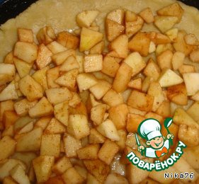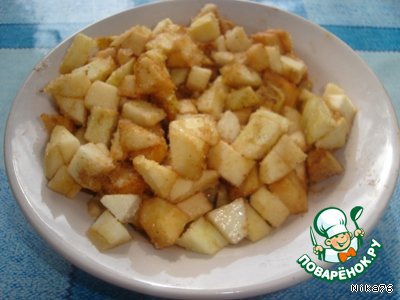 Очистить яблоки, нарезать. Смешать с сахаром и корицей.