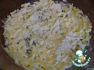• Следующий слой тертые яйца, промазать майонезом, затем капуста (горсточка для хруста).