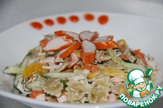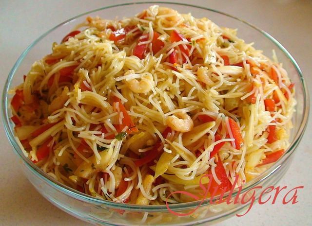 Обожаю фунчозу (фун-ту-цзи), т. е. рисовую лапшу, из-за еe прекрасных качеств: во-первых - она является низкокалорийной, а во-вторых - способствует хорошему пищеварению. Рисовая лапша также издавна считается средством для восстановления сил, поддержания сексуальной энергии и долголетия. Согласно легенде, именно это блюдо регулярно ели японские воины-ниндзя. Для салата готовится интересная заправка, а восточные специи придают особый вкус и аромат... Источник - журнал "Лиза".