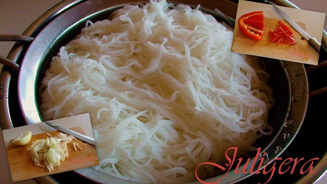 Фунчозу залить 750 мл кипящей воды, оставить на 10 мин, затем откинуть на сито. Воду собрать. Перец и лук нарезать тонкой соломкой (по рецепту лука добавляется в салат - 4 шт, но у меня был злющий, поэтому вполне хватило двух штук, да и главное, чтобы не было перебора...).
