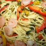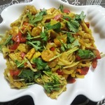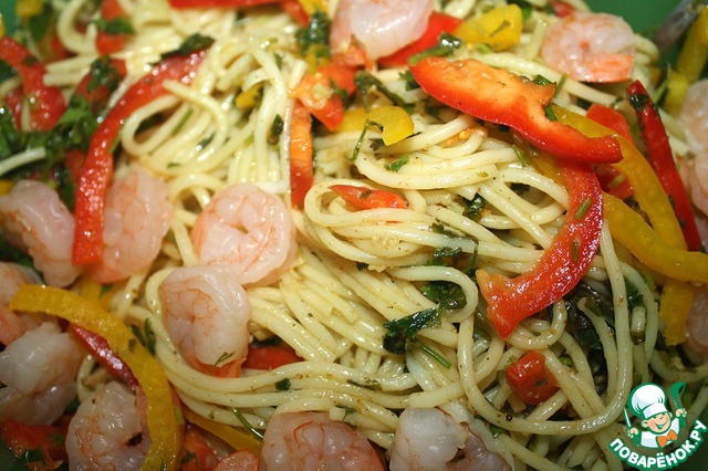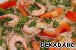 Лапшу крупно порезать, смешать с креветками, перцем, луком и оставшейся кинзой. Полить маринадом и перемешать. Угощайтесь!