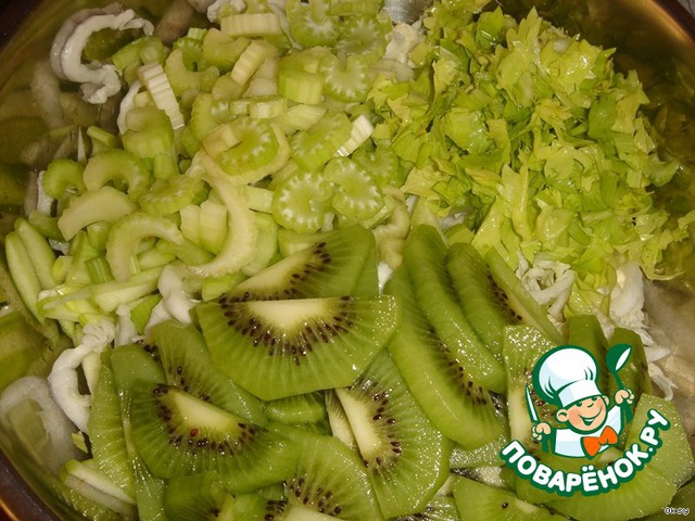Киви очистить, разрезать пополам, затем пластиками. Стебли сельдерея измельчить.