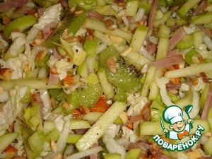 Салат готовила для себя, когда потихоньку, добавляя по ингредиенту (немного яблок, пара киви, горсть пекинской капусты, чуть-чуть сельдерея... ) набралась приличная порция, решила поделиться с мужем, но для этого нужно было в салат добавить хоть немного мяса. Мяса оказалось совсем немного, поэтому добавила еще миндаль и семечки. Результат удовлетворил и меня, и мужа!