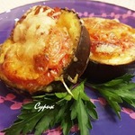Беру баклажан (30 минут в соли не держу и не обжариваю), режу кружочками, присаливаю, сверху кружок помидора, чеснок (по желанию), ломтик сыра и в духовку.