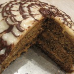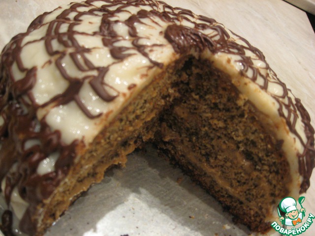 ТЕСТО: 4ст.л. кофе растворить в 2ст.л. горячей воды. Взбить 200г масла и сахар, по одному ввести яйца. Всыпать просеянную муку и разрыхлитель. Добавить 4ст.л. растворенного кофе и еще немного орехов.