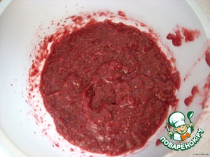 От общей массы отложить 1/4 часть, а в остальную добавить малиновое пюре.