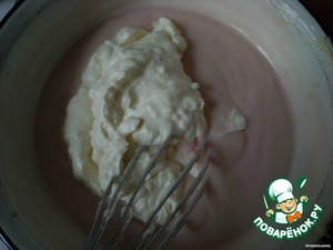 От общей массы отложить 1/4 часть, а в остальную добавить малиновое пюре. -