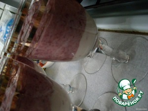 • На дно креманок (у меня бокалы) разложить отложенную массу, а сверух выложить массу с малиновым пюре и поставить в холодильник до полного охлаждения.
