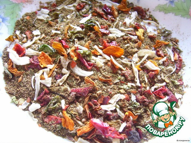 Ну и, конечно же, какое блюдо без специй - я смешала черный перец, чили, шафран, хмели-сунели, сушеные перец и лук.