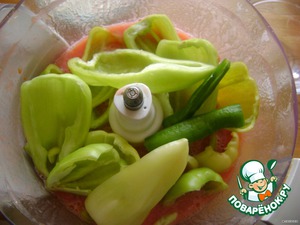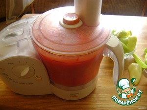 К томатному пюре добавить болгарский и горький перец и также измельчить.