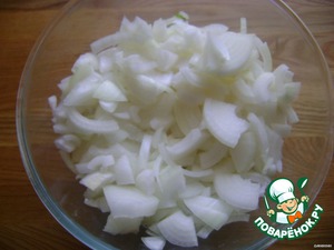 Репчатый лук нарезать и обжарить в растительном масле до золотистого цвета, добавить остывшие баклажаны и жарить до румяной корочки (минут 30)