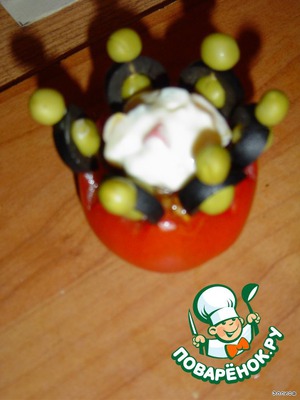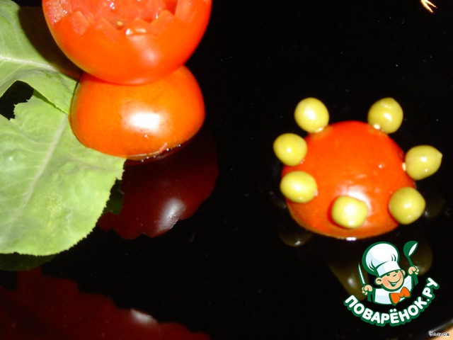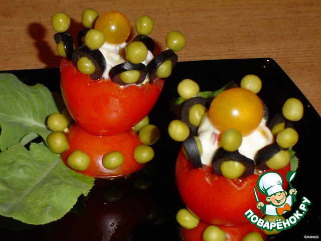 • Оставшаяся часть помидора будет служить подставкой, к которой с помощью зубочисток прикрепляем горошины.