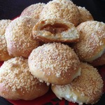 Каждый шарик раскатывать и класть в центр немного (не больше чайной ложки неполной) любой начинки, я делала с черничным вареньем, можно с ягодами или фруктами, вареной сгущенкой, половинкой конфеты "коровка", если варенье слишком жидкое, то добавьте в него немного муки или панировочных сухарей.