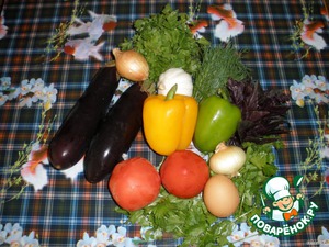 Режем овощи.Баклажаны солим и выдерживаем до мягкости,помидоры обдаем кипятком, снимаем кожицу и режем кружками, лук режем тонкими кольцами, перец нарезаем четвертинками, можно и мельче, зелень мелко шинкуем, взбиваем 1 или 2 яйца, в зависимости от размера...
