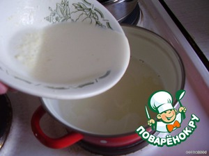 Эту смесь осторожно влить в закипевшее молоко с сахаром. И варить крем, помешивая, пока он загустеет и закипит. После того, как смесь закипела снять ее с огня и еще несколько минут помешивать.
