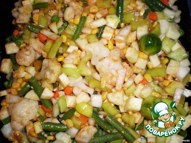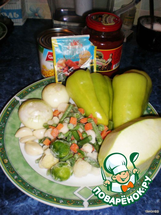 Смазать маслом плоскую форму,положить чеснок,лук,перец,помидоры с соком(или влить томатную пасту),кукурузу,овощную смесь,кабачок,посыпать солью и красным перцем.