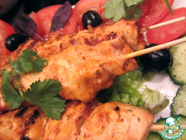 Пока любимый мужчина колдует над шашлычком, можно нежной дамской рукой порезать овощи... И вот... наконец то румяный... ароматнейший шашлычок готов...