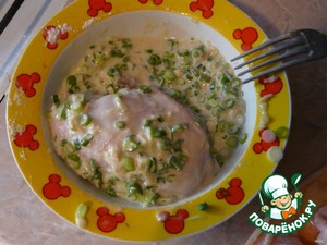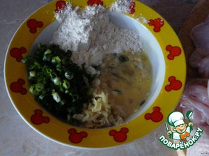 Слегка взбить яйцо, положить в него мелко порезанный лук, потертый имбирь, добавить муку, хереса. Соли нет!! Получается жидкое тесто.