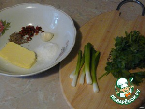 Зелень и специи размять в ступке, соединить со сливочным маслом