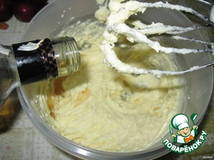 Добавляем коньяк, соду гашеную уксусом и половину муки.