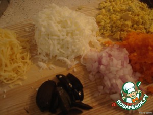 Трем, отдельно, белок и желток на терке, сыр, морковь. Мелко режем лук и маслинки.