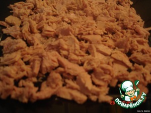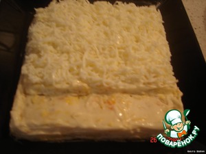 Укладываем на рыбку потертые и порезанные продукты и создаем форму.